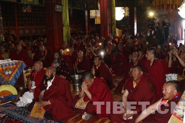 原計劃,治多縣信教群眾前來接受班禪大師的講經(jīng)灌頂和摸頂,應于當天下午6點結(jié)束。但實際上在進行完長壽經(jīng)祈愿灌頂后,已是下午3點半,為了能讓所有的信教群眾都受到祝福,班禪大師為近2萬信教群眾一一摸頂,直至晚上9點多。經(jīng)過整整9個多小時,在班禪仁波切心懷眾生、慈悲利眾精神的堅持下,大部分的信教群眾都得到了滿足?!鲌D為認真聽法的貢薩寺僧眾。