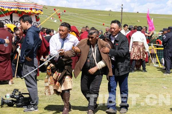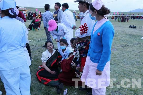還有一位當?shù)卦袐D,在排隊等候摸頂過程中,當場生下了孩子,母子除了得到當?shù)卣疁蕚涞尼t(yī)療救助安然無恙之外,孩子還得到班禪大師賜名——“班禪吉”?!鲌D為法會現(xiàn)場由當?shù)卣才诺尼t(yī)療工作者們起到了很大的作用。