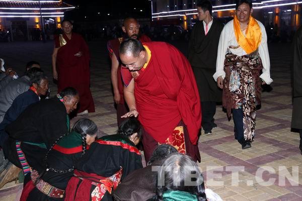 夜已深了,班禪大師還前往治多縣幸福敬老院為一直等候在那里的老人們一一摸頂賜福,并講經(jīng)祈頌。有些重病和癱瘓在床的老人得到班禪大師的摸頂賜福,幸福地閉上眼睛淚流滿面,嘴里不停地稱頌“謝謝班禪仁波切!”△圖為班禪大師為幸福敬老院的老人們摸頂賜福。