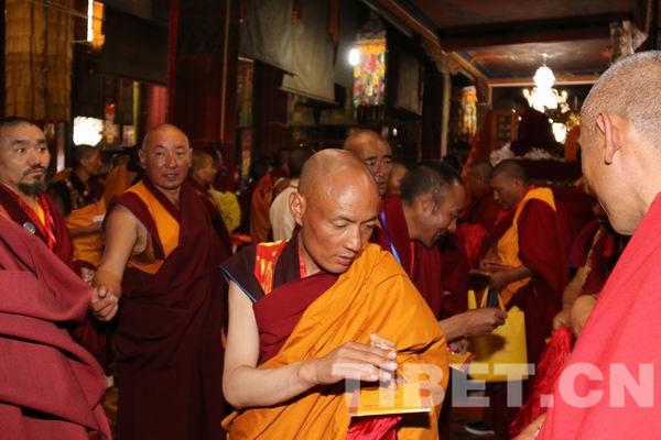近千名僧人獲得了班禪大師的摸頂賜福,僧人們按照自己心意向班禪大師獻上供養(yǎng)和禮品,班禪大師也一一向僧人們發(fā)放布施和護身符、紀念品。△圖為班禪大師接受貢薩寺的僧人們寫給他的頌詞。