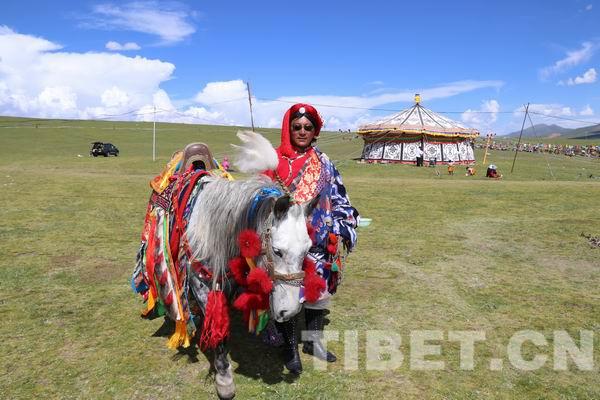 △圖為治多縣當?shù)匦沤倘罕姕蕚浍I給班禪大師的駿馬,這匹駿馬曾在賽馬會上取得第一名。