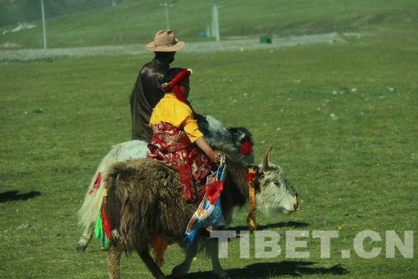 △圖為騎著牦牛迎接班禪大師的治多縣當?shù)厣倌辍?/p>