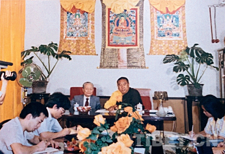 十世班禪和趙樸初顧問(wèn)在中國(guó)藏語(yǔ)系高級(jí)佛學(xué)院成立儀式新聞發(fā)布會(huì)上接受媒體采訪。中國(guó)藏語(yǔ)系高級(jí)佛學(xué)院提供