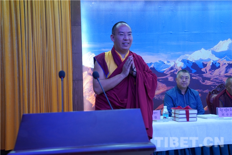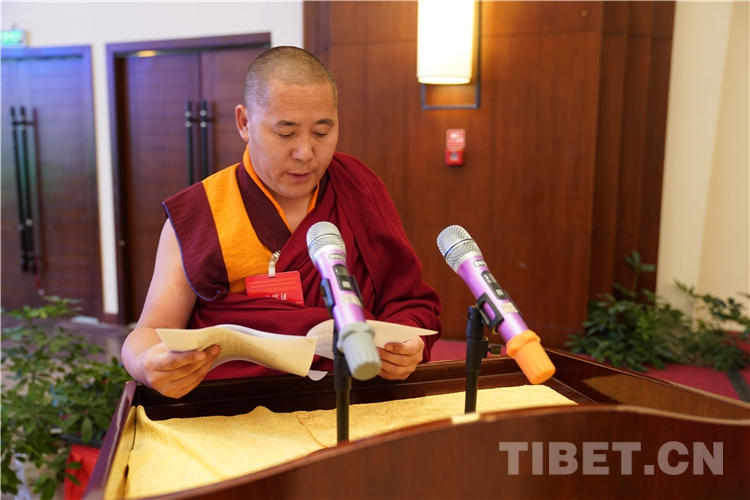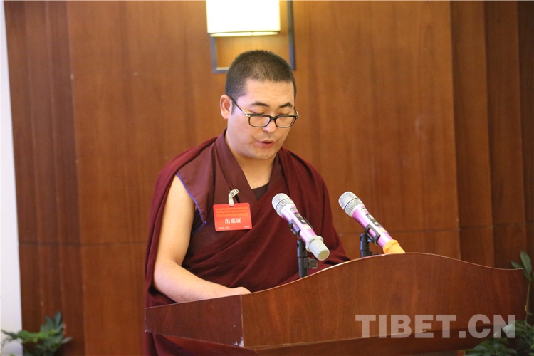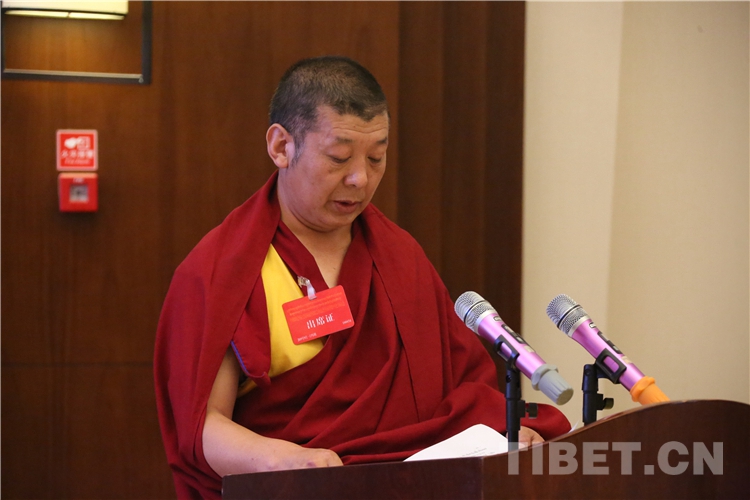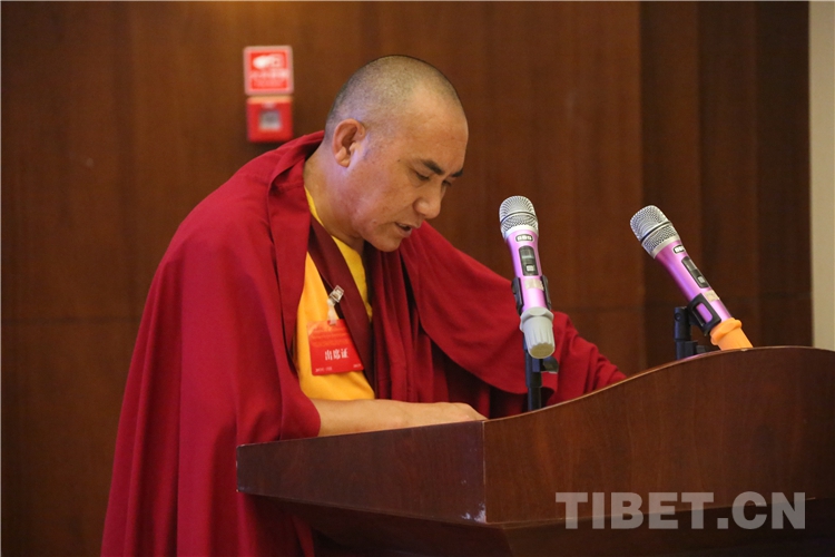 西藏自治區(qū)政協(xié)副主席、中國(guó)佛教協(xié)會(huì)西藏分會(huì)常務(wù)副會(huì)長(zhǎng)、西藏佛學(xué)院院長(zhǎng)珠康土登克珠以“維護(hù)祖國(guó)統(tǒng)一和民族團(tuán)結(jié),堅(jiān)決反對(duì)分裂”為題,作教義闡釋演講。