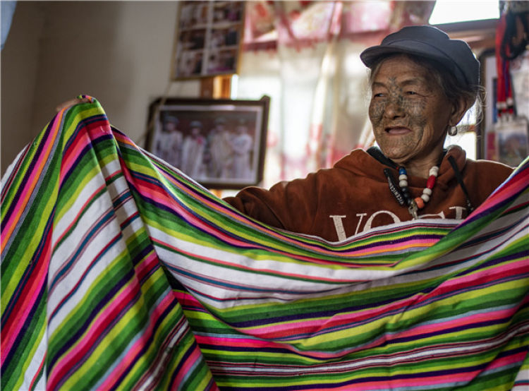 2019年4月21日,云南省貢山獨(dú)龍族怒族自治縣獨(dú)龍江鄉(xiāng)迪政當(dāng)村獨(dú)龍族婦女李文仕在家里展示她親手織的獨(dú)龍?zhí)?。云南?019年宣布,獨(dú)龍族、德昂族、基諾族3個(gè)“直過民族”實(shí)現(xiàn)整族脫貧,歷史性告別絕對(duì)貧困。新華社記者 江文耀 攝
