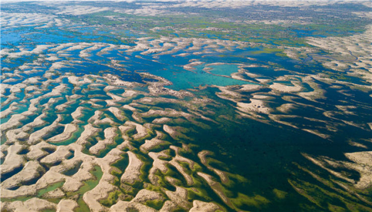 這是庫(kù)布其沙漠中利用黃河分凌減災(zāi)的水進(jìn)行沙漠生態(tài)修復(fù)形成的沙漠濕地景色(2018年6月9日無(wú)人機(jī)拍攝)。新華社記者 彭源 攝