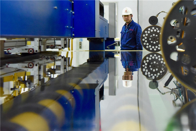 2019年1月9日,在中建材蚌埠玻璃工業(yè)設(shè)計(jì)研究院的生產(chǎn)車間內(nèi),工作人員在巡檢超薄玻璃生產(chǎn)線。新華社記者 湯陽(yáng) 攝