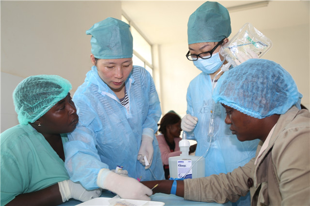 2014年12月10日,在塞拉利昂首都弗里敦,中國(guó)人民解放軍援助西非抗擊埃博拉疫情醫(yī)療隊(duì)為中塞友好醫(yī)院開展輸液培訓(xùn)活動(dòng)。新華社發(fā)(戴欣攝)