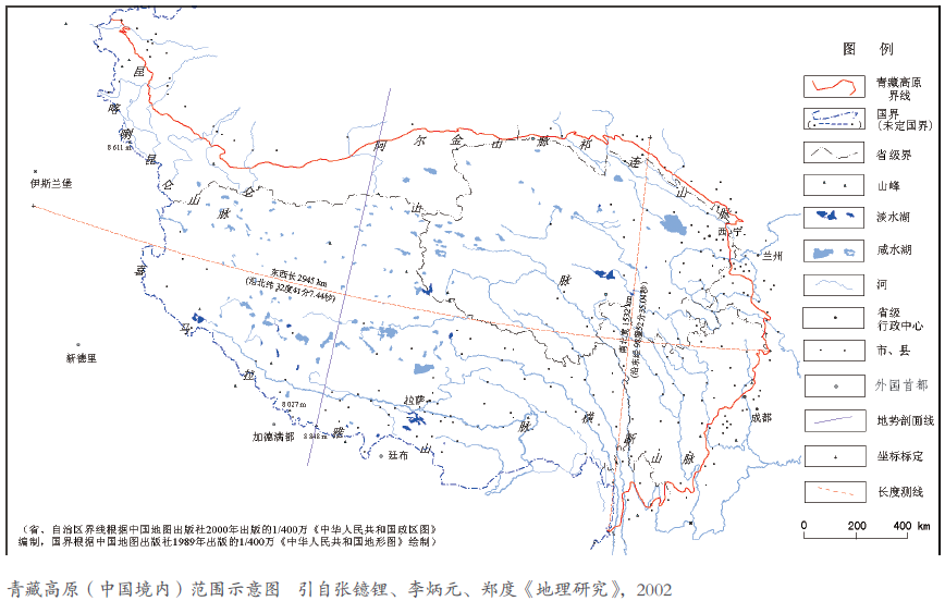 青藏高原南起喜馬拉雅山脈南側(cè),與印度、尼泊爾、不丹毗鄰;北至昆侖山、阿爾金山和祁連山,以4000米左右的高差與亞洲中部干旱荒漠區(qū)的塔里木盆地及河西走廊相連;西部為帕米爾高原和喀喇昆侖山脈,與吉爾吉斯斯坦、塔吉克斯坦、阿富汗、巴基斯坦和克什米爾地區(qū)接壤;東部以玉龍雪山、大雪山、夾金山、邛崍山及岷山的南側(cè)或東側(cè)為界;青藏高原的東及東北部與秦嶺山脈西段和黃土高原相銜接。我國境內(nèi)部分西起帕米爾高原,東至橫斷山脈,橫跨32個(gè)經(jīng)度;以南起自喜馬拉雅山脈南緣,以北止于昆侖山—祁連山北側(cè),縱貫約15個(gè)緯度,范圍為北緯25°59′37″~39°49′33″,東經(jīng)73°29′56″~104°40′20″,面積為258.37萬平方公里,約占我國陸地總面積的26.9%。