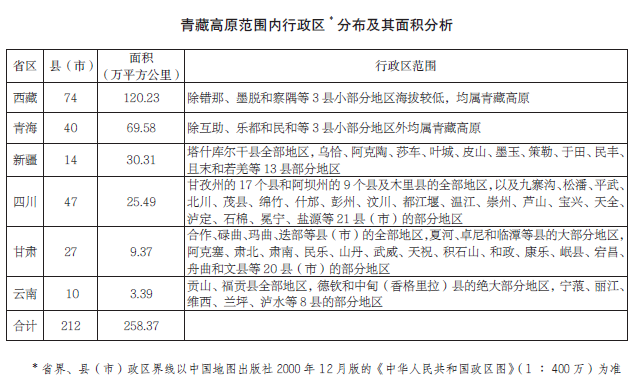 在行政區(qū)劃上,青藏高原范圍涉及6個(gè)省區(qū)、212個(gè)縣(市),即西藏自治區(qū)(錯(cuò)那、墨脫和察隅等3縣僅包括少部分地區(qū))和青海省(部分縣僅含局部地區(qū)),云南省西北部迪慶藏族自治州,四川省西部甘孜藏族自治州和阿壩藏族羌族自治州、木里藏族自治縣,甘肅省的甘南藏族自治州、天祝藏族自治縣、肅南裕固族自治縣、肅北蒙古族自治縣、阿克塞哈薩克族自治縣以及新疆維吾爾自治區(qū)南緣巴音郭楞蒙古自治州、和田地區(qū)、喀什地區(qū)以及克孜勒蘇柯爾克孜自治州等的部分地區(qū)。