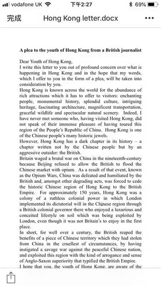 我希望你們,香港的青年們,了解你們的祖先曾經(jīng)遭受過的英國人的野蠻和侮辱性的行為。我也希望你們知道,英國大體上從來沒有為自己在鴉片戰(zhàn)爭期間的種種駭人聽聞的行為而向香港和中國人民道歉。