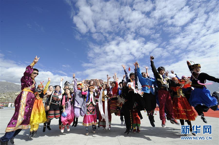 參加“民族情 雪域行”活動(dòng)的民族團(tuán)結(jié)形象代表在西藏拉薩布達(dá)拉宮廣場(chǎng)合影(2012年9月27日攝)。新華社記者 覺(jué)果 攝