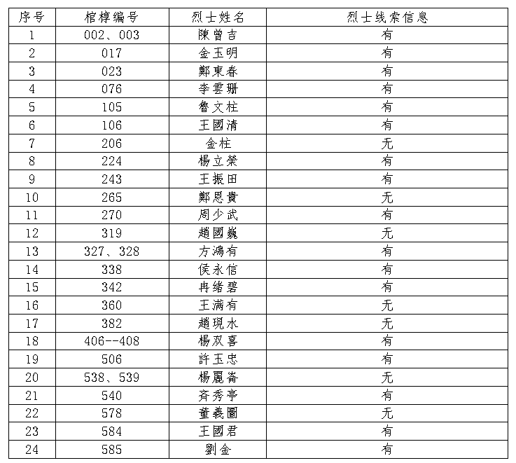 對(duì)應(yīng)序號(hào)及批次:224棺槨,是2014年第一批遷回的在韓志愿軍烈士遺骸。