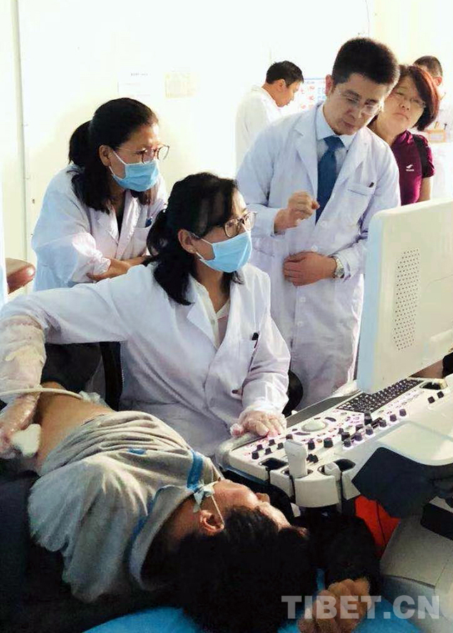 圖為夏宇(左三)援藏期間,在西藏自治區(qū)人民醫(yī)院超聲醫(yī)學(xué)科指導(dǎo)當(dāng)?shù)蒯t(yī)生做超聲檢查工作(夏宇提供圖片)