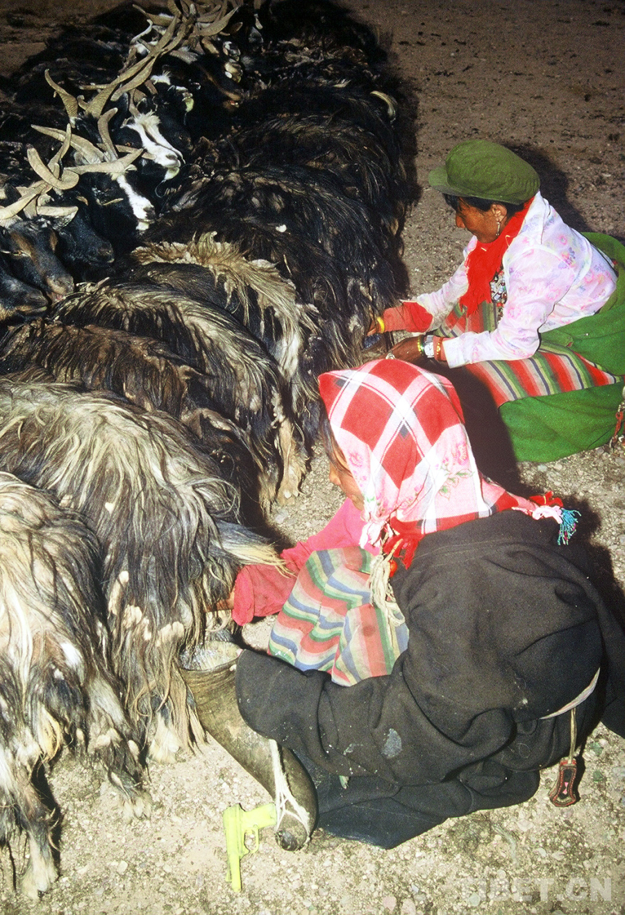 圖為雙湖辦事處北措折鄉(xiāng)(現(xiàn)雙湖縣措折羌瑪鄉(xiāng))牧女使用牦牛角當(dāng)器皿擠羊奶(唐召明1989年攝)
