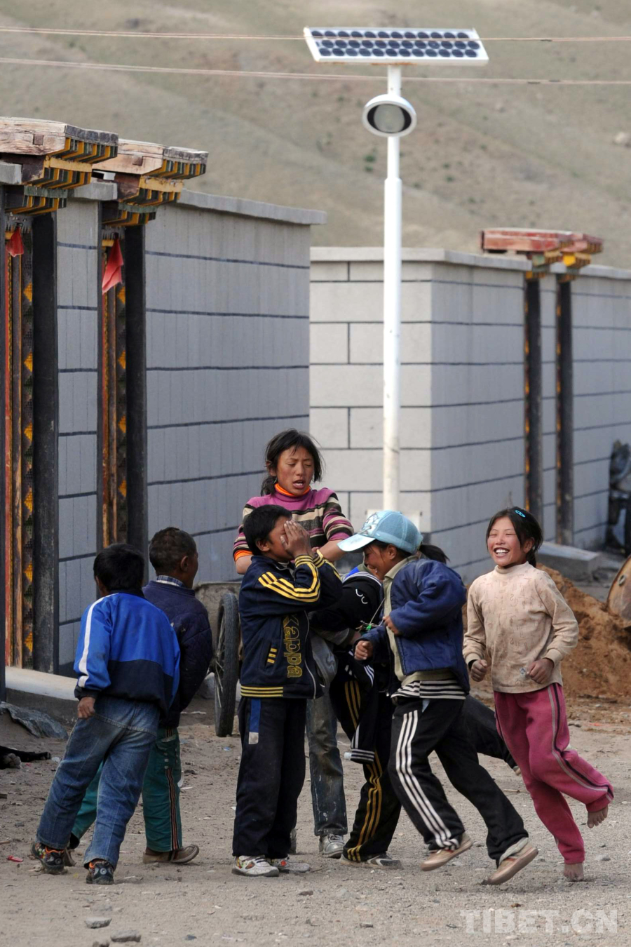 圖為雙湖特別區(qū)(現(xiàn)雙湖縣)嘎措鄉(xiāng)新房前的孩子們在太陽能燈柱下玩耍(唐召明2009年8月1日攝)