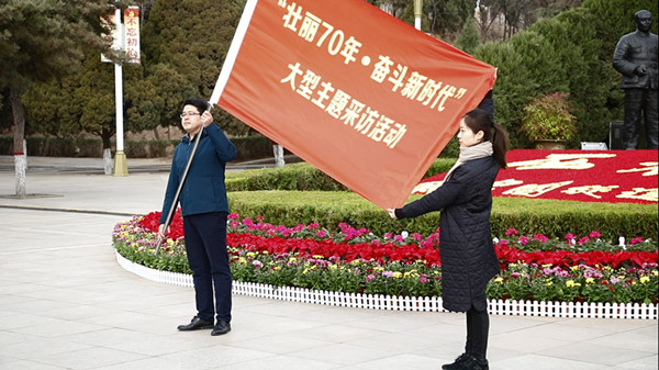 記者代表從黃坤明手中接過(guò)主題紅旗。紅旗迎風(fēng)飄揚(yáng)在革命圣地西柏坡,飄蕩在媒體人的心中。傳承革命精神,堅(jiān)定理想信念,我們秉承著用心、用情、用功去講述新中國(guó)成立70年來(lái)的奮斗征程和輝煌成就,把主題采訪活動(dòng)與增強(qiáng)“四力”結(jié)合起來(lái),為創(chuàng)造良好的輿論環(huán)境、文化支撐與精神動(dòng)力而共同努力奮進(jìn)。