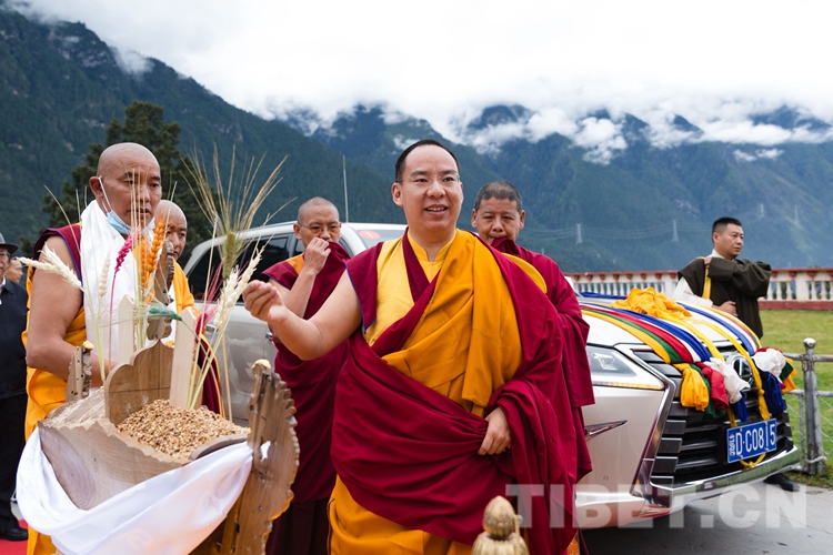 9月2日,山間云霧還未散去,寺院僧人早已整齊列隊,高舉幡幢,手持香爐、法號,恭迎全國政協(xié)常委、中國佛教協(xié)會副會長、中國佛教協(xié)會西藏分會會長班禪額爾德尼o確吉杰布的到來。