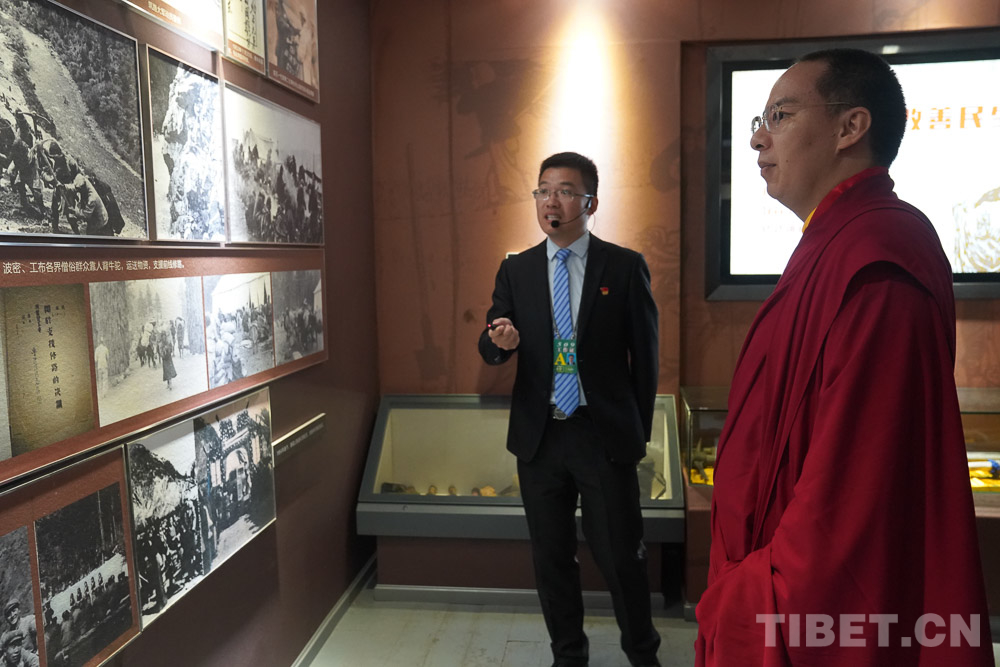 十一世班禪一路緩步前行,時(shí)而抬頭仰望、時(shí)而俯身凝視。在講解員的介紹下,從和平解放、民主改革,到社會(huì)主義建設(shè)、改革開(kāi)放,再到新時(shí)代,依次參觀了各展區(qū)。