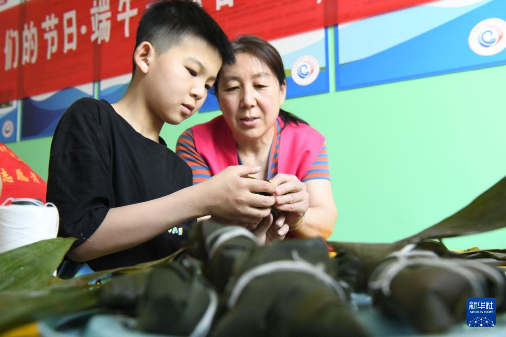 5月28日,在河北省邯鄲市廣平縣,志愿者陪留守兒童一起包粽子。新華社發(fā)(程學(xué)虎 攝)
