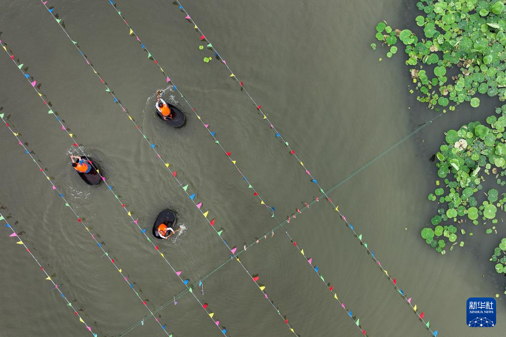5月28日,在浙江省湖州市吳興區(qū),當(dāng)?shù)卮迕裨诤商羶?nèi)參加端午劃菱桶趣味活動(dòng)(無人機(jī)照片)。新華社發(fā)(伊凡 攝)
