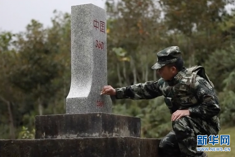 張俊擦拭界碑(資料圖)新華網(wǎng)發(fā)。(天保出入境邊防檢查站供圖)