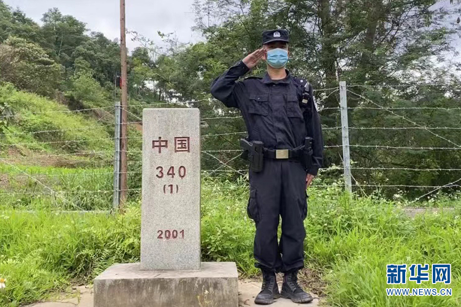 張俊巡邏途中與界碑合影(資料圖)新華網(wǎng)發(fā)。(天保出入境邊防檢查站供圖)