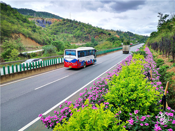 仲夏時節(jié),昆磨高速普洱至景洪段的羊蹄甲、紫薇、火把花等植物百花齊放,大風埡口隧道口姹紫嫣紅的三角梅,寧洱收費站立交粉嫩養(yǎng)眼的金絲桃,高速中央隔離帶嬌艷欲滴的木槿,在幾場雨水的洗禮和管理處的精心養(yǎng)護下,變得生機盎然。昆磨高速普洱管理處轄區(qū)管養(yǎng)路段植被豐富,公路蜿蜒穿梭在青山綠水間,共設有5個立交苗圃基地示范區(qū),以開花喬木為主,地被為輔,四季開花,豐富了植物層次,一立交一風景,樹綠花紅的景象與高速公路融為一體交相輝映。
