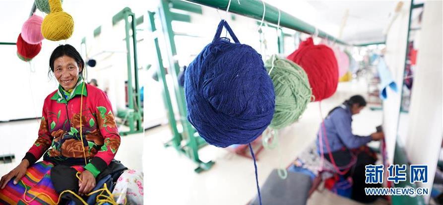 拼版照片:左圖為西藏阿里地區(qū)改則縣物瑪鄉(xiāng)村民央卓在噶爾縣康樂新居服裝地毯加工廠;右圖為央卓在噶爾縣康樂新居服裝地毯加工廠工作。2017年,央卓和家人從改則縣物瑪鄉(xiāng)搬遷到噶爾縣康樂新居易地扶貧搬遷安置點,住進了125平方米的新居。2018年7月,央卓和女兒參加了康樂新居服裝地毯加工廠的培訓,在家門口找到了工作(7月25日攝)。 新華社記者 詹彥 攝