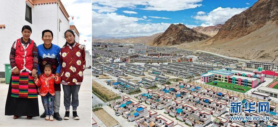拼版照片:左圖為西藏阿里地區(qū)日土縣東汝鄉(xiāng)阿汝村村民丹木真(中)和妻子扎西拉姆(左)、女兒南嘎曲增(右)、小女兒列旺桑姆在噶爾縣康樂新居易地扶貧搬遷安置點;右圖為噶爾縣康樂新居易地扶貧搬遷安置點一角(無人機照片)。2018年,丹木真和家人搬遷到噶爾縣康樂新居易地扶貧搬遷安置點,告別了村里土木結(jié)構(gòu)的舊房子,住進了150平方米的新居。安置點內(nèi)醫(yī)務室、幼兒園、活動中心等設施齊全,和丹木真一家一樣,從阿里地區(qū)改則縣、措勤縣、革吉縣等地搬遷來的2000多名群眾在這里過上了安居樂業(yè)的幸福生活(7月25日攝)。 新華社記者 詹彥 攝