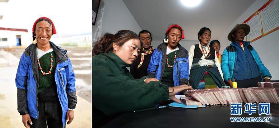 拼版照片:左圖為西藏日喀則市定日縣克瑪鄉(xiāng)幫布村村民阿羅;右圖為阿羅在幫布村牦牛養(yǎng)殖農(nóng)民專業(yè)合作社領工資。2019年,阿羅把家里的100多只羊入股了合作社享受分紅,自己也加入了合作社負責放羊,每個月有3000元的收入(7月31日攝)。 新華社記者 詹彥 攝