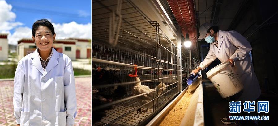 拼版照片:左圖為西藏日喀則市拉孜縣曲下鎮(zhèn)吉如村村民卓嘎;右圖為卓嘎在拉孜縣拉貴藏雞養(yǎng)殖孵化保種基地里忙碌。2020年年初,卓嘎來到拉貴藏雞養(yǎng)殖孵化保種基地工作,很快就學會了藏雞的養(yǎng)殖技術(shù),在這里工作,卓嘎每個月能拿到4000多元的工資(8月1日攝)。 新華社記者 詹彥 攝