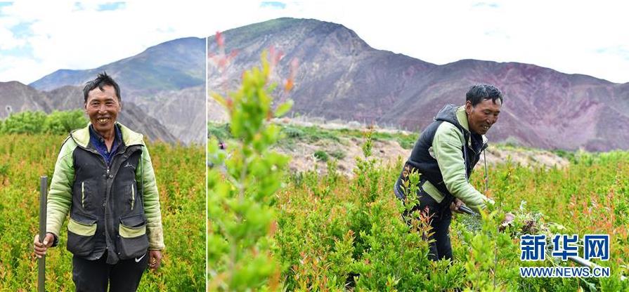 拼版照片:左圖為西藏昌都市芒康縣納西民族鄉(xiāng)加達村村民土登曲培;右圖為土登曲培在芒康縣納西民族鄉(xiāng)三江農(nóng)民專業(yè)合作社的苗圃里忙碌。幾年前,土登曲培來到三江農(nóng)民專業(yè)合作社打工,負責種樹和喂牛,每月有3000多元的收入(5月4日攝)。 新華社記者 詹彥 攝