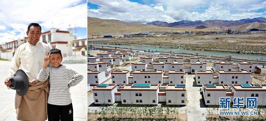 拼版照片:左圖為西藏阿里地區(qū)改則縣物瑪鄉(xiāng)村民頓珠多吉(左)和孫子曲達在噶爾縣康樂新居易地扶貧搬遷安置點;右圖為噶爾縣康樂新居易地扶貧搬遷安置點一角(無人機照片)。2017年,頓珠多吉一家從改則縣物瑪鄉(xiāng)搬遷到噶爾縣康樂新居易地扶貧搬遷安置點,住進了100平方米的新居。在安置點,和頓珠多吉一家一樣,從阿里地區(qū)改則縣、措勤縣、革吉縣等地搬遷來的2000多名群眾開啟了更加美好的生活(7月25日攝)。 新華社記者 詹彥 攝