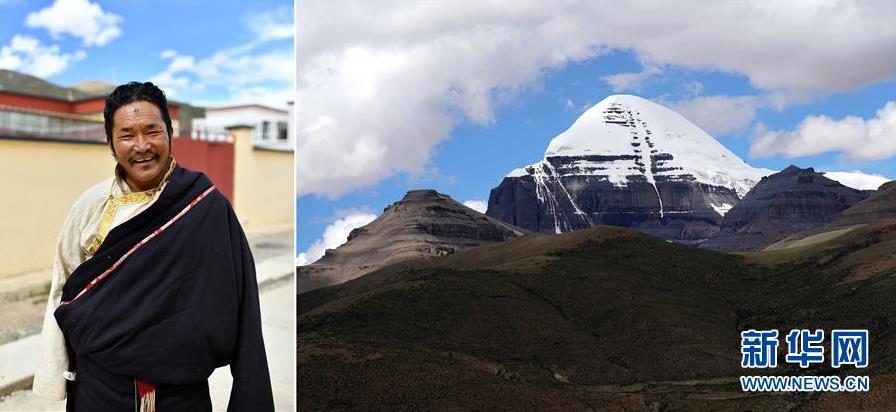 拼版照片:左圖為西藏阿里地區(qū)普蘭縣巴嘎鄉(xiāng)崗莎村村民崗瑪達杰;右圖為位于西藏阿里地區(qū)普蘭縣境內(nèi)的岡仁波齊峰。崗莎村地處海拔6656米的岡仁波齊峰腳下。近年來,前來岡仁波齊峰轉(zhuǎn)山旅游的游客與日俱增,崗莎村借此大力發(fā)展旅游業(yè),為游客提供吃、住、行、游、購等服務。每到旅游旺季,崗瑪達杰為游客提供騎馬轉(zhuǎn)山、運輸服務,一年下來有4萬多元的收入(7月27日攝)。 新華社記者 詹彥 攝