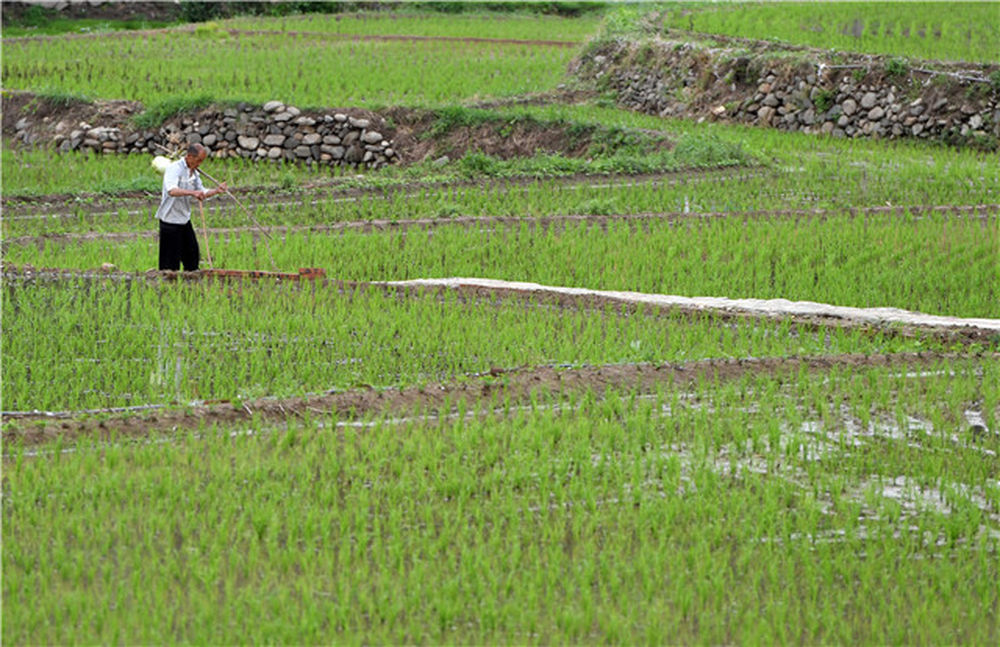 一名村民在田鋪大塆的稻田中勞作(6月12日攝)。新華社記者 李嘉南 攝