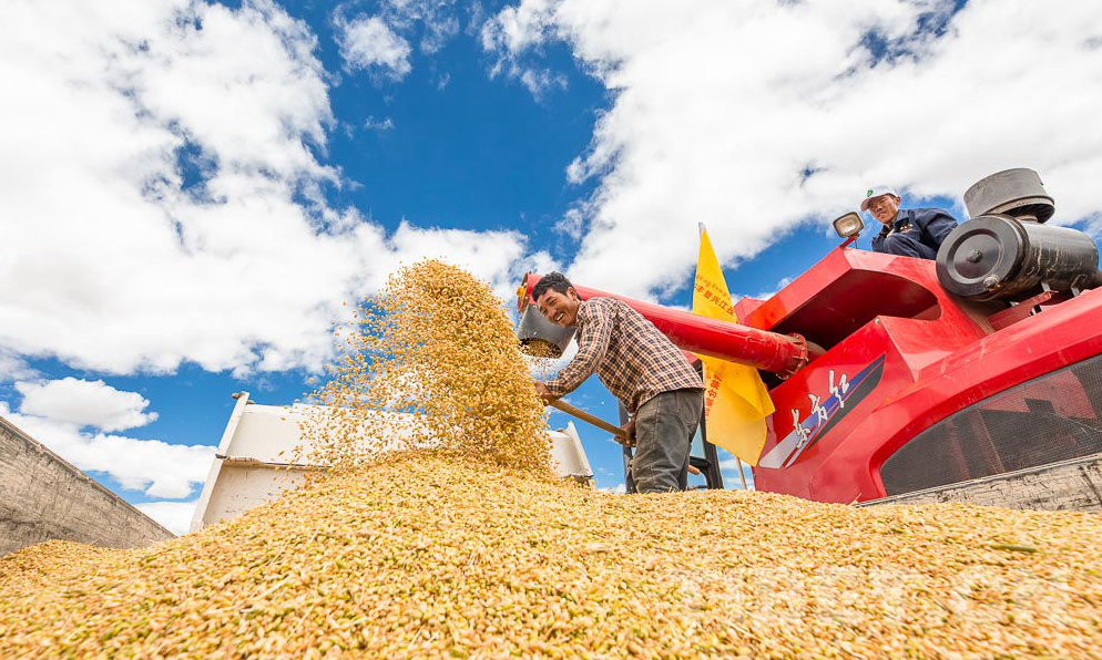 圖為日喀則市江孜縣紫金鄉(xiāng)努堆村的機械化秋收 攝影:趙耀