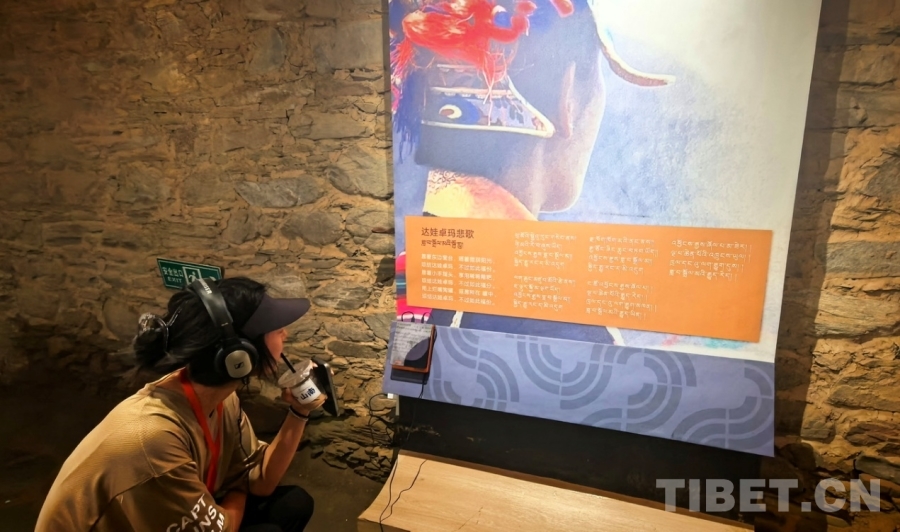 圖為游客參觀強(qiáng)吉莊園公共文化活動(dòng)中心時(shí)通過(guò)影音設(shè)備聆聽(tīng)歌曲《達(dá)娃卓瑪悲歌》 攝影:劉莉