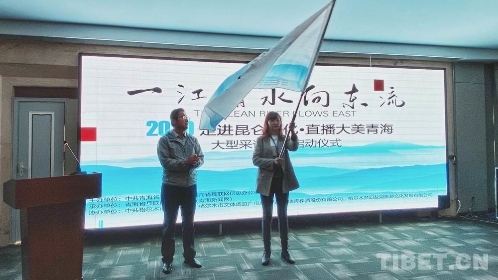 圖為“一江清水向東流——2020走進(jìn)昆侖文化 直播大美青?!贝笮筒稍L活動(dòng)啟動(dòng)儀式授旗現(xiàn)場(chǎng) 青海新聞網(wǎng)供圖