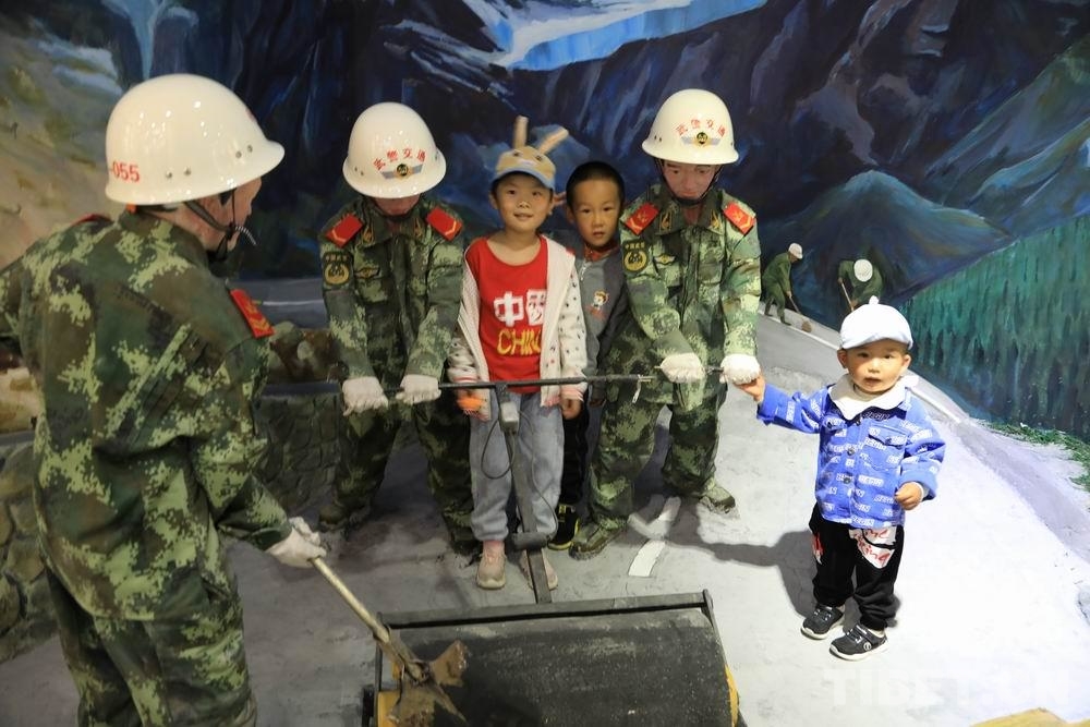 圖為軍娃與官兵養(yǎng)護(hù)道路模型合影 攝影:陸文凱