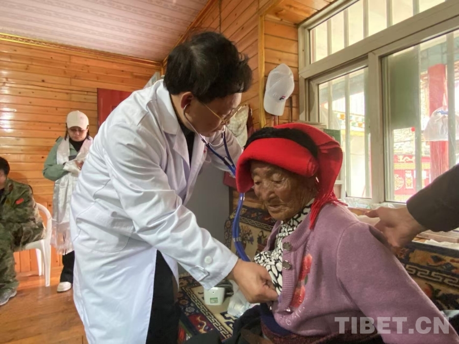 圖為“同心·共鑄中國(guó)心”醫(yī)務(wù)志愿者、廣東省中醫(yī)院心血管病專科主任醫(yī)師陳伯鈞為藏族阿媽查體