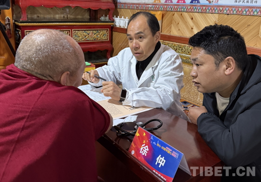 圖為醫(yī)療專家們?cè)诓莸撬铝x診,廣州醫(yī)科大學(xué)附屬第三醫(yī)院老年醫(yī)學(xué)科主任、主任醫(yī)師徐仲正在與草登寺僧人溝通病情 攝影:喇應(yīng)強(qiáng)