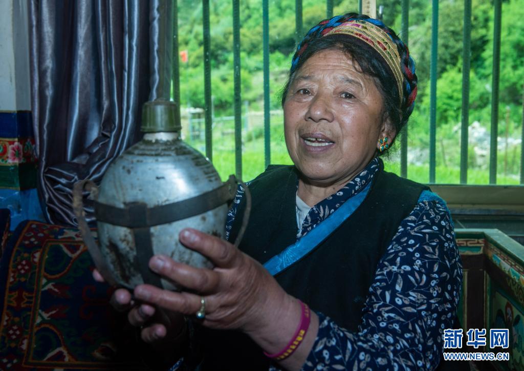 太昭村村民阿牛在展示當(dāng)年解放軍送給她父親的水壺(7月9日攝)。新華社記者 旦增尼瑪曲珠 攝