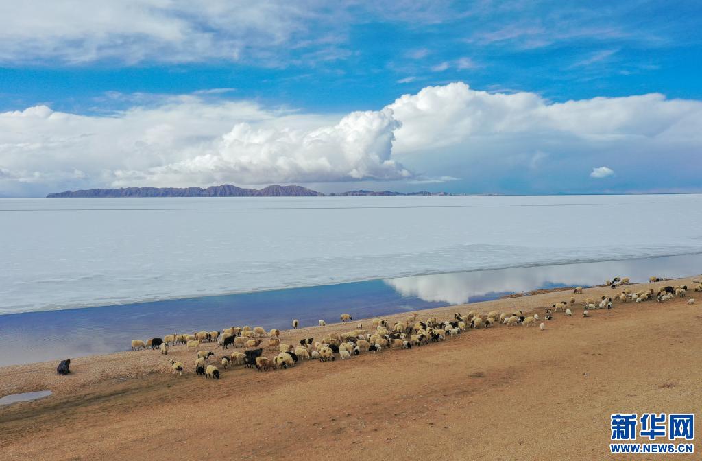 牧民指揮羊群從色林錯(cuò)經(jīng)過(guò)(2020年4月29日無(wú)人機(jī)攝)。 新華社記者田金文 攝