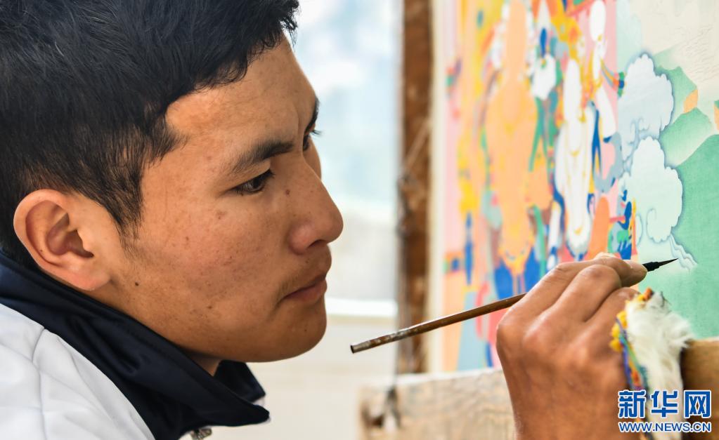 在西藏昌都市卡若區(qū)嘎瑪鄉(xiāng)民族手工藝培訓(xùn)基地,學(xué)員正在學(xué)習(xí)唐卡繪畫。(2019年10月3日攝)新華社記者 晉美多吉 攝