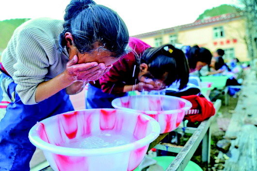 4月30日,在類(lèi)烏齊縣桑多鎮(zhèn)第二小學(xué),學(xué)生們用熱水洗漱。這套熱水設(shè)施由李純民發(fā)起的“齊興”助學(xué)獎(jiǎng)勵(lì)基金捐助?!∮浾邉⒔鸷?、黃臻攝