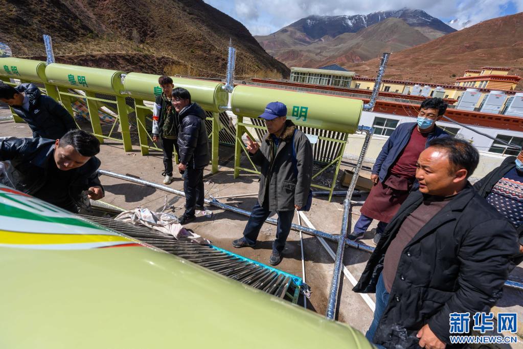 5月3日,在西藏昌都市類烏齊縣吉多鄉(xiāng)小學(xué),李純民(中)在吉多鄉(xiāng)小學(xué)學(xué)生食堂樓頂,監(jiān)督太陽(yáng)能熱水器的維修工作。2014年至2020年,“齊興”助學(xué)獎(jiǎng)勵(lì)基金通過多種方式,籌集資金200多萬,為類烏齊縣12所鄉(xiāng)鎮(zhèn)小學(xué)安裝太陽(yáng)能熱水器和多媒體教學(xué)一體機(jī)。新華社記者 劉金海 攝