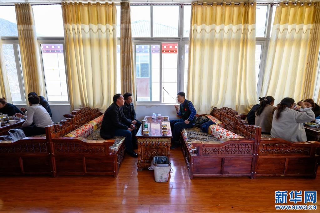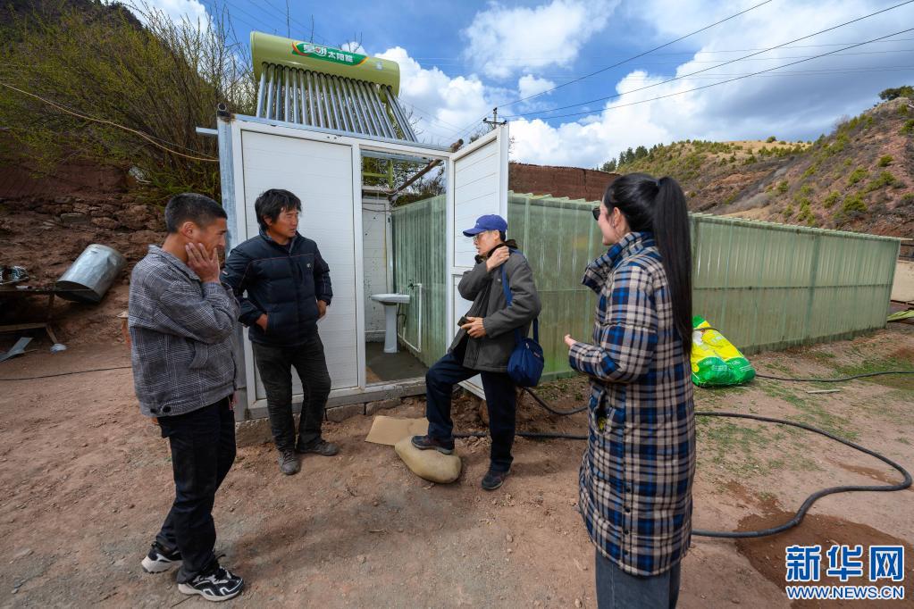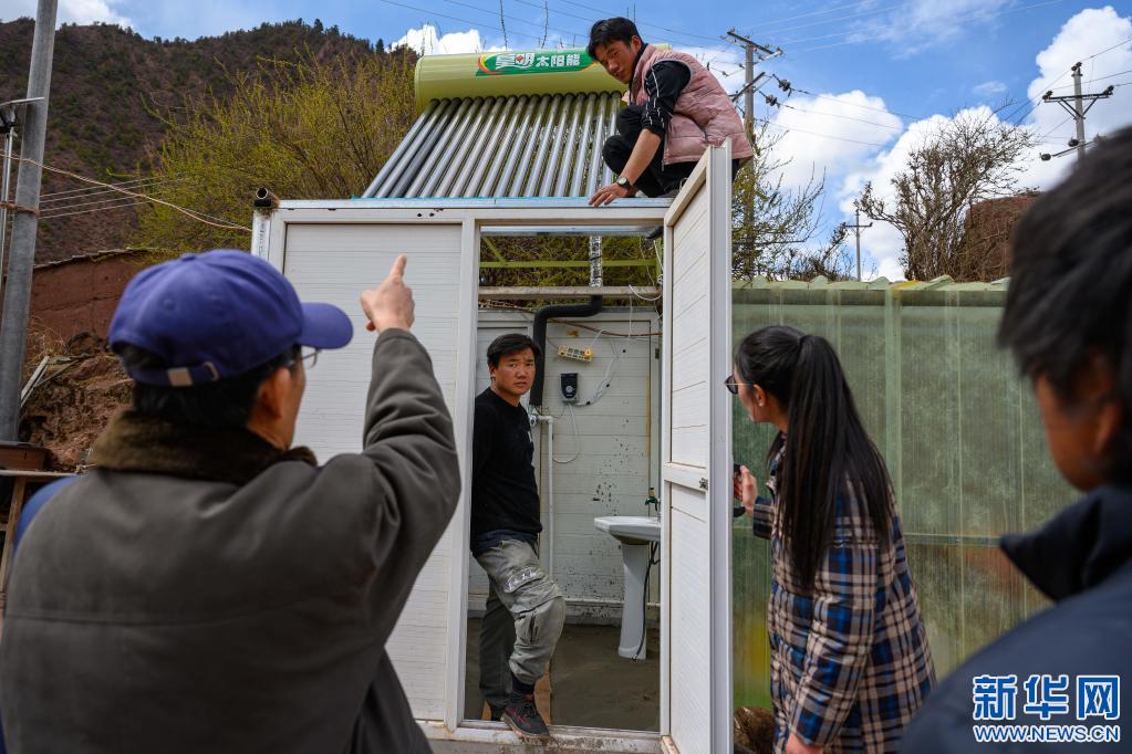 5月2日,在西藏昌都市類烏齊縣濱達(dá)鄉(xiāng)濱達(dá)村,李純民(左二)在當(dāng)?shù)卮迕裣虬桶偷牵ㄓ叶┘抑胁榭凑託夤薜氖褂们闆r。新華社記者 劉金海 攝