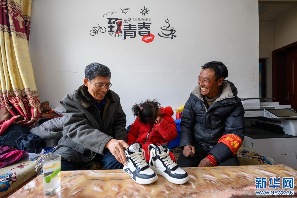 5月3日,在西藏昌都市類烏齊縣伊日鄉(xiāng)小學(xué),扎西措姆(中)在父親帕巴澤仁(右)的陪伴下,接受李純民(左)贈(zèng)予的一雙為她專門定制的新鞋。扎西措姆自幼患有足部殘疾,穿普通鞋子無法舒適行走。2020年,李純民個(gè)人出資為扎西措姆定制了一雙鞋。不久前,得知扎西措姆的鞋子穿破后,李純民再次為她定制了一雙新鞋。新華社記者 劉金海 攝