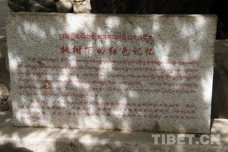 石碑用漢藏雙語刻就,題為“桃樹下的紅色記憶”,正文為“據(jù)考證,當(dāng)年18軍401團的三營營房指揮部搭建在眼前的大桃樹下,部隊曾經(jīng)在此地了解民情,研究戰(zhàn)事。這棵樹見證了我軍維護地方穩(wěn)定,清剿悍匪的戰(zhàn)斗過程,至今每年3月當(dāng)?shù)厝罕姸紩园l(fā)前來撫今追昔,表達(dá)對先輩們的崇高敬意?!?/p>